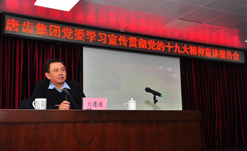 2017年12月21日下午,唐齿集团党委召开学习宣传贯彻党的十九大精神宣讲报告会。各基层党支部书记、全体中层及以上党员干部参加会议。市国资委副调研员刘德维同志、党建处处长王俊泉等同志出席报告会。
