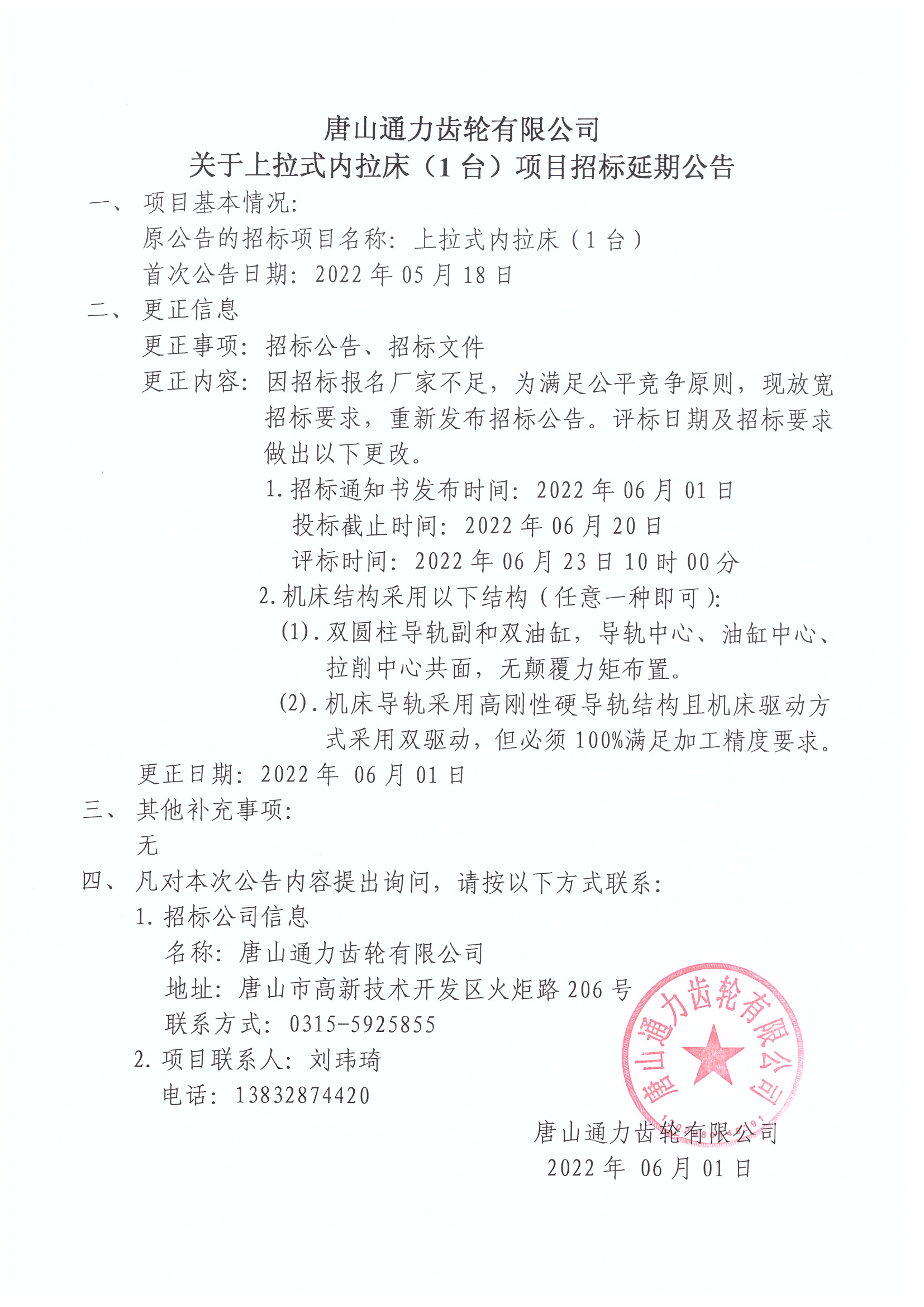 唐山通力齿轮有限公司关于上拉式内拉床(1台)项目招标延期公告
