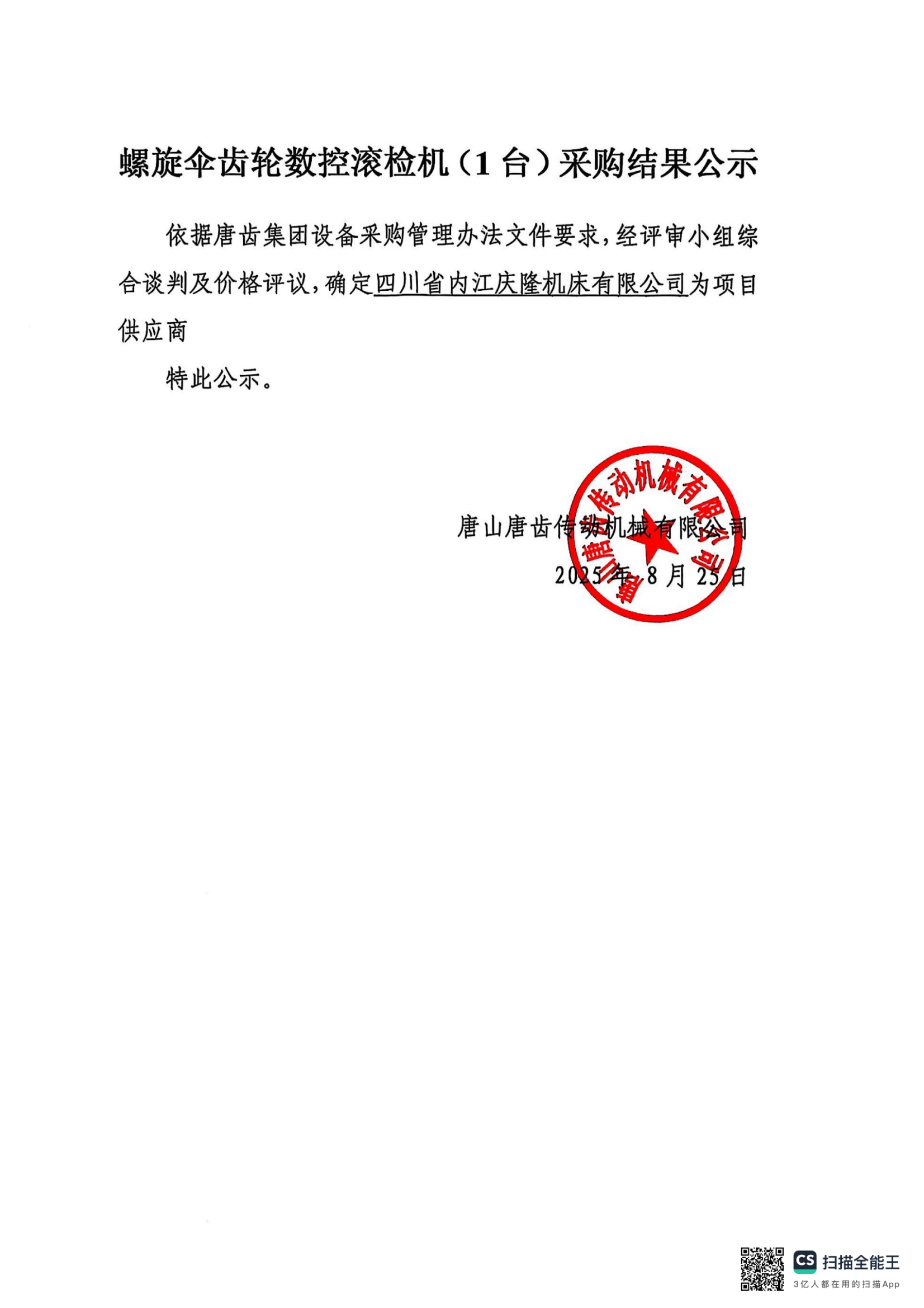 唐山传动齿轮机械有限公司 螺旋伞齿轮数控滚检机(1台)采购结果公示