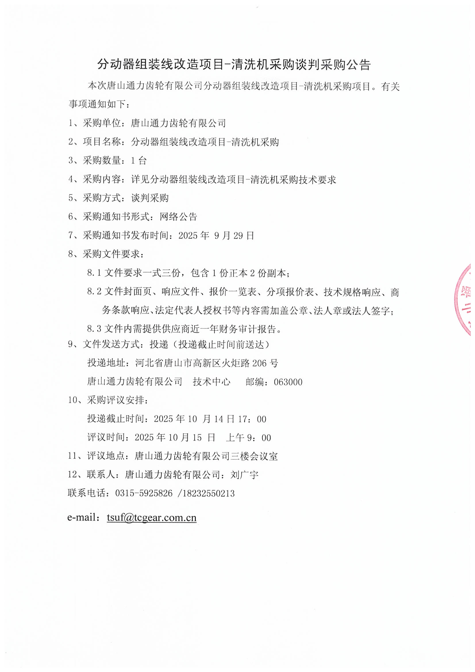 唐山通力齿轮有限公司 分动器组装线改造项目-清洗机采购公告